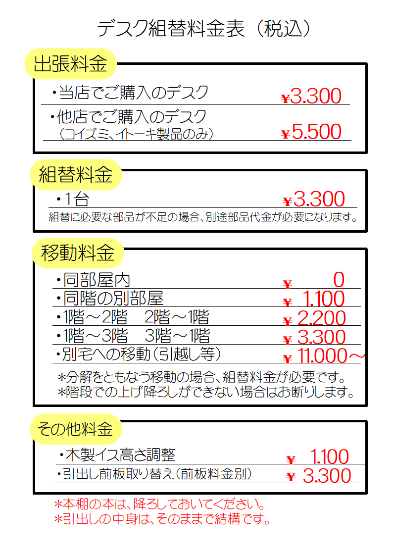 ・お使いのデスクが当店でお買い上げのデスクの場合と他店でご購入の場合とで出張料金が違いますが、その他の料金は同じです。